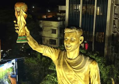 استقبال رفيع المستوى! كولكاتا بالهند تزيح الستار عن تمثال جديد لميسي بارتفاع 21 متراً وهو يحمل كأس العالم